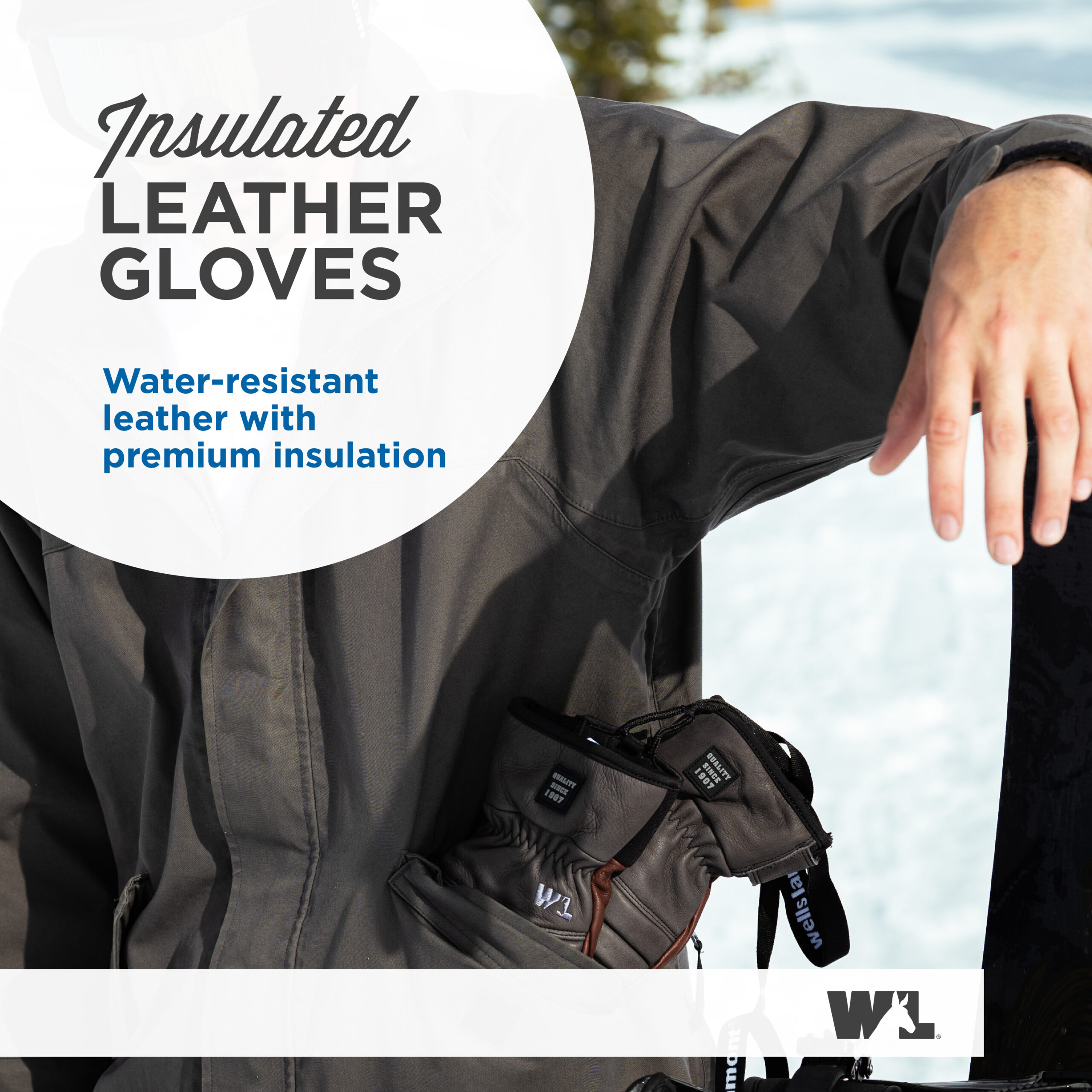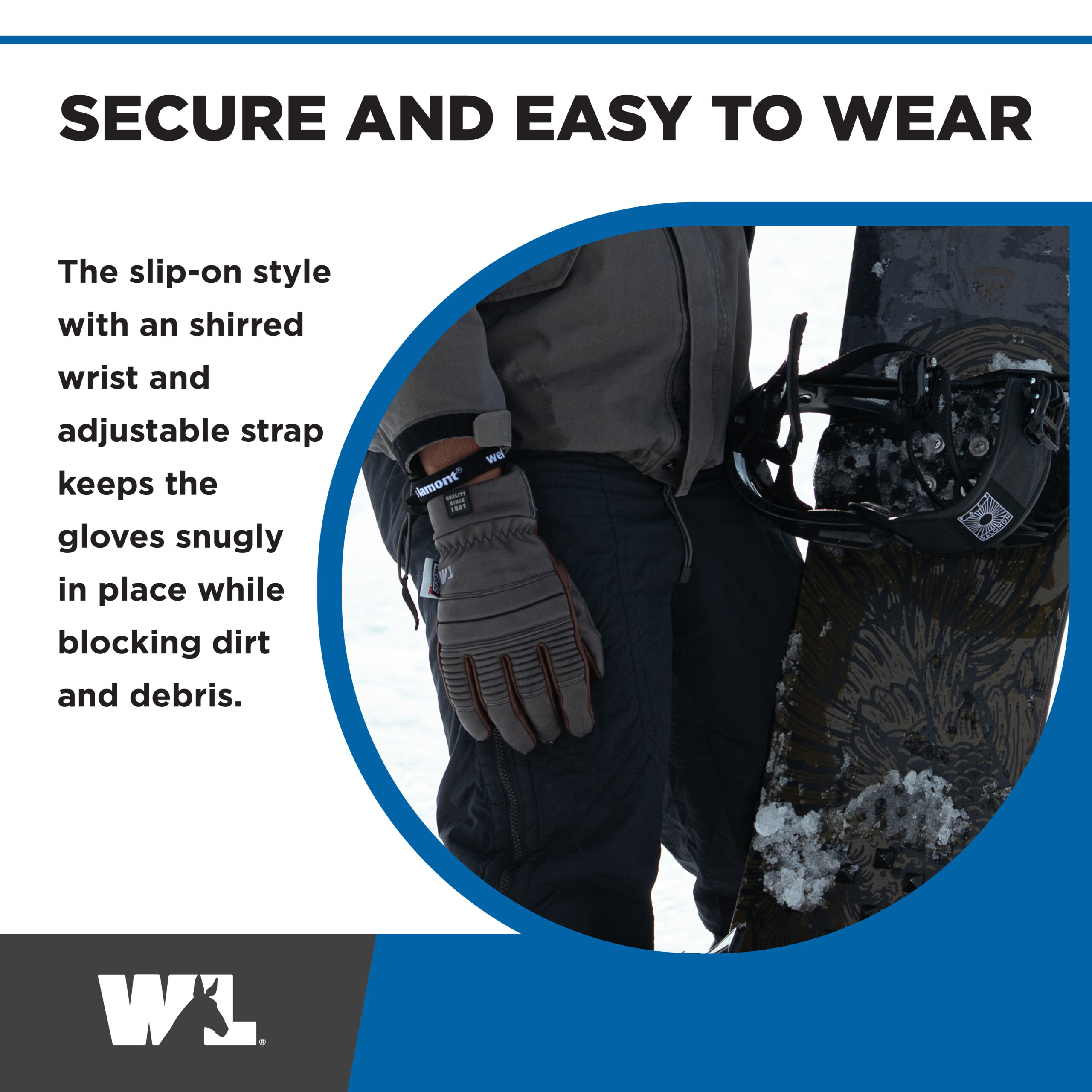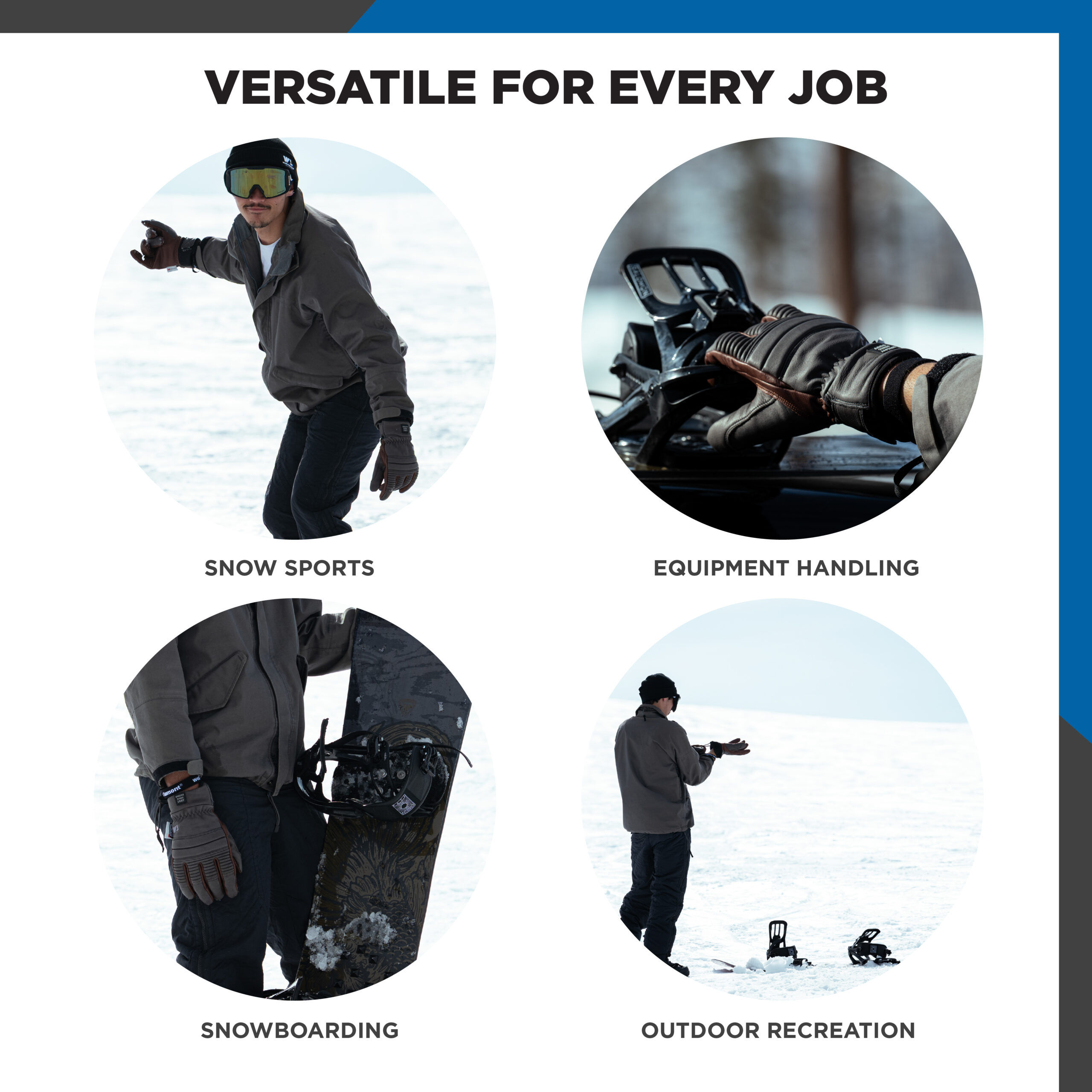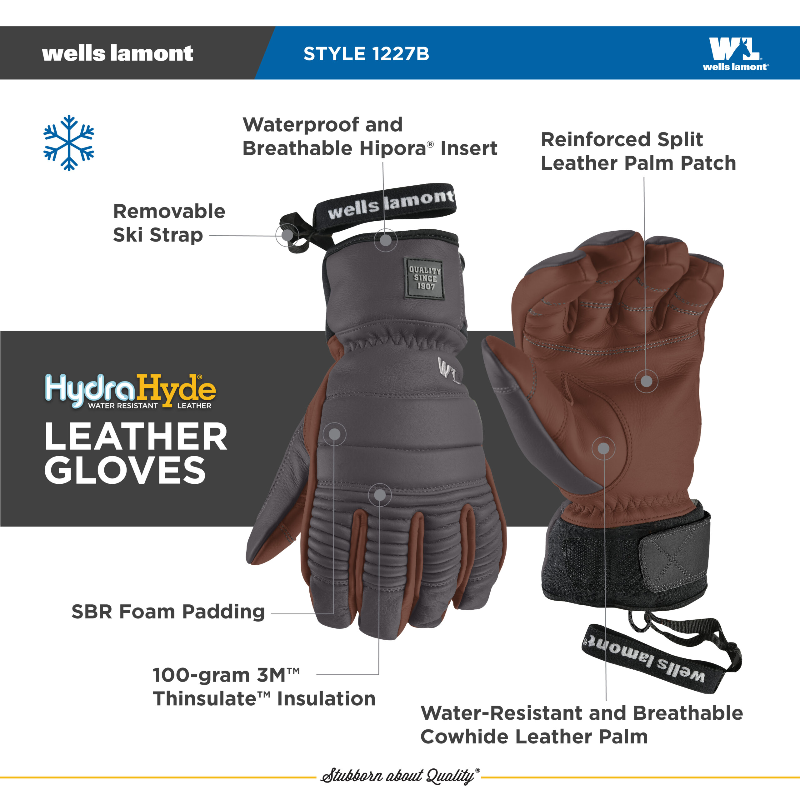 Stay dry and warm with our premium gloves featuring water-resistant HydraHyde® leather and 3M™ Thinsulate™ insulation. SBR foam padding offers added comfort and durability. Includes a waterproof Hipora® insert, removable ski strap leather pull tab, and carabiner for convenience.